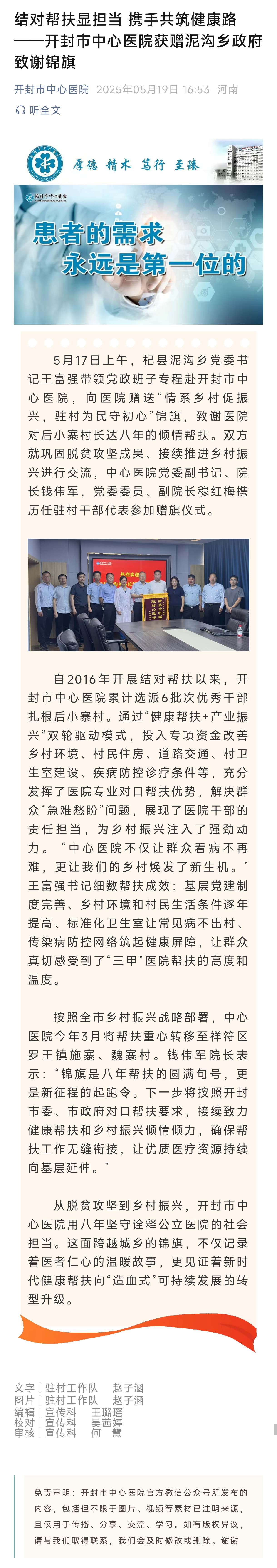 结对帮扶显担当 携手共筑健康路--开封市中心医院获赠泥沟乡政府致谢锦旗